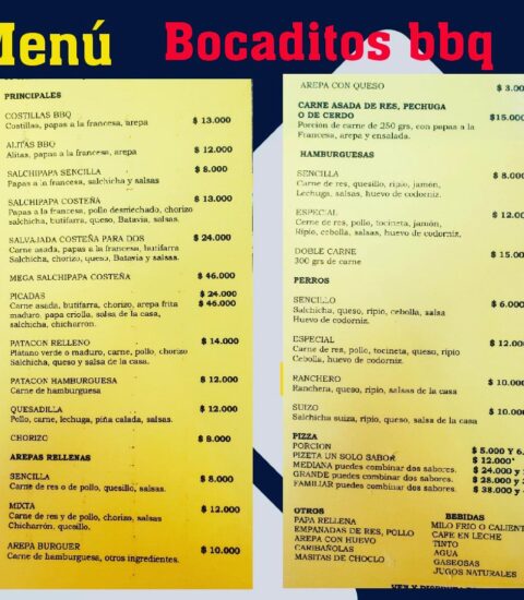salchipapa Costeña, patacón Relleno, arepas rellenas, picadas, hamburguesas, perros, chorizos, pizza, quesadillas, alitas y costillas a la bbq, empanadas, papas rellenas, jugos naturales, bebidas gaseosa, y otros productos visita nuestro menú.