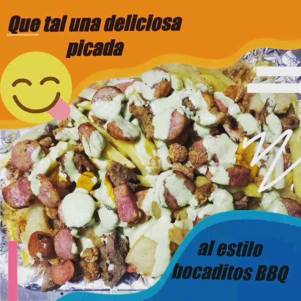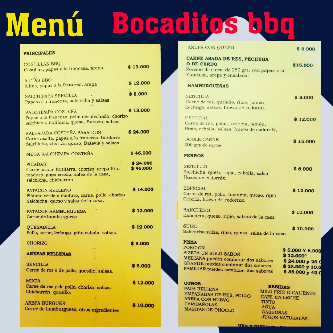 salchipapa Costeña, patacón Relleno, arepas rellenas, picadas, hamburguesas, perros, chorizos, pizza, quesadillas, alitas y costillas a la bbq, empanadas, papas rellenas, jugos naturales, bebidas gaseosa, y otros productos visita nuestro menú.